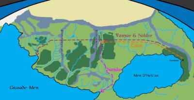 Le voyage des Vanyar et des Noldor continue : ils traversent les Ered Luin ou Montagnes Bleues, qui se dressent entre Eriador et le Beleriand. Puis ils descendent la vallée du Sirion pour rejoindre les rives de la Grande Mer.
