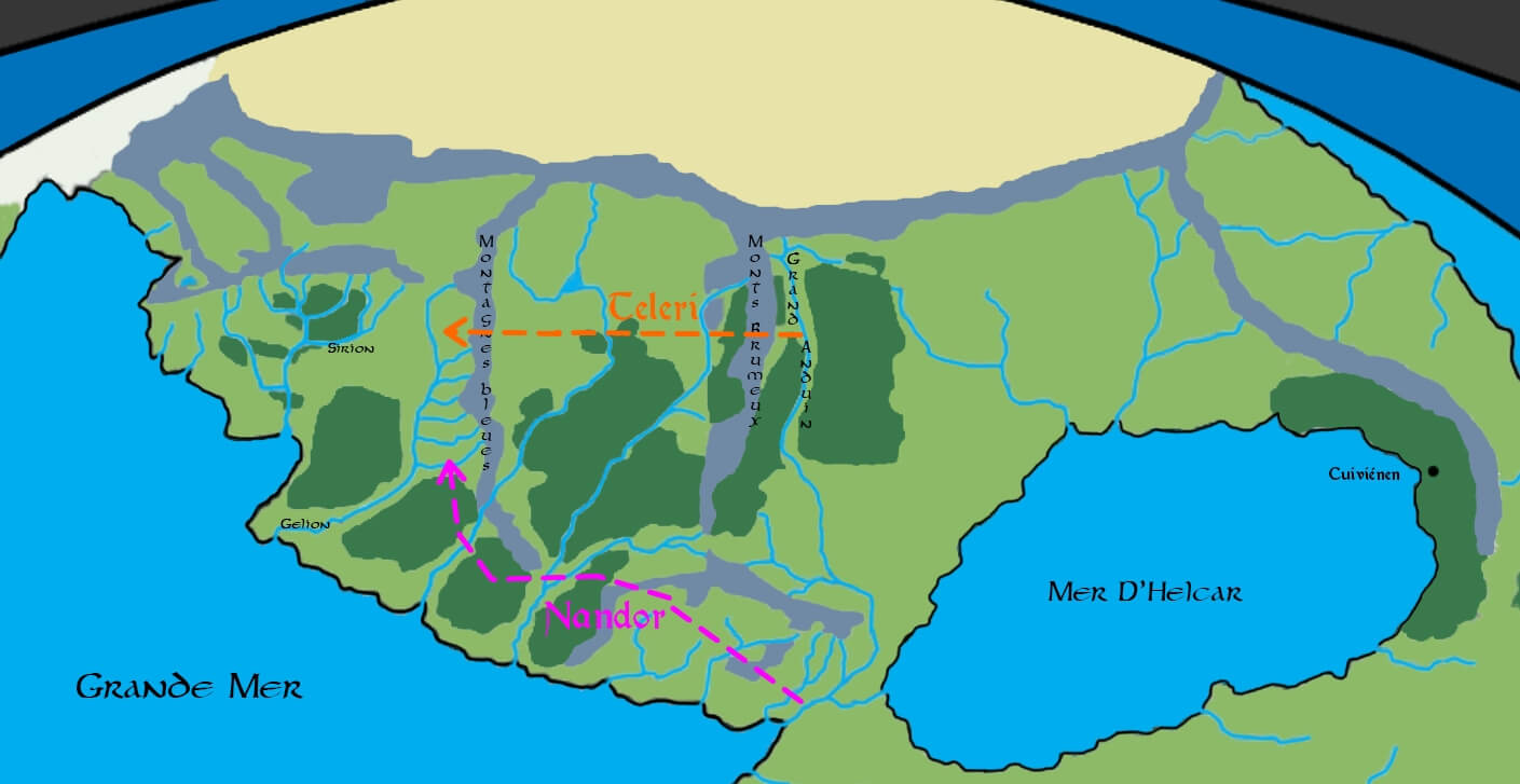 Finalement, ne voulant pas rester éloignés des Noldor, les Teleri franchissent les Montagnes de la Brume, traversent l’Eriador, les Ered Luin et arrivent en Beleriand. Ils s'arrêtent quelque temps près du fleuve Gelion.