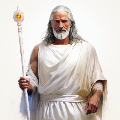 “un vieillard, drapé d’une ample cape de couleur indéfinissable, car elle changeait de ton chaque fois qu’ils promenaient le regard, ou quand le vieillard bougeait. Il avait le visage long et le front haut, des yeux noirs et profonds … Il avait la barbe et les cheveux blancs, mais des mouchetures de noir se voyaient encore au pourtour des lèvres et des oreilles.”