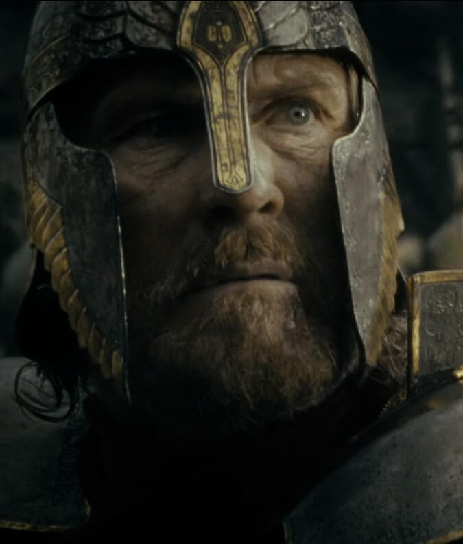 Faramir remet la couronne d’Eärnur, le dernier roi et la donne à Aragorn qui la soulève et dit au sujet de son ancêtre Elendil: