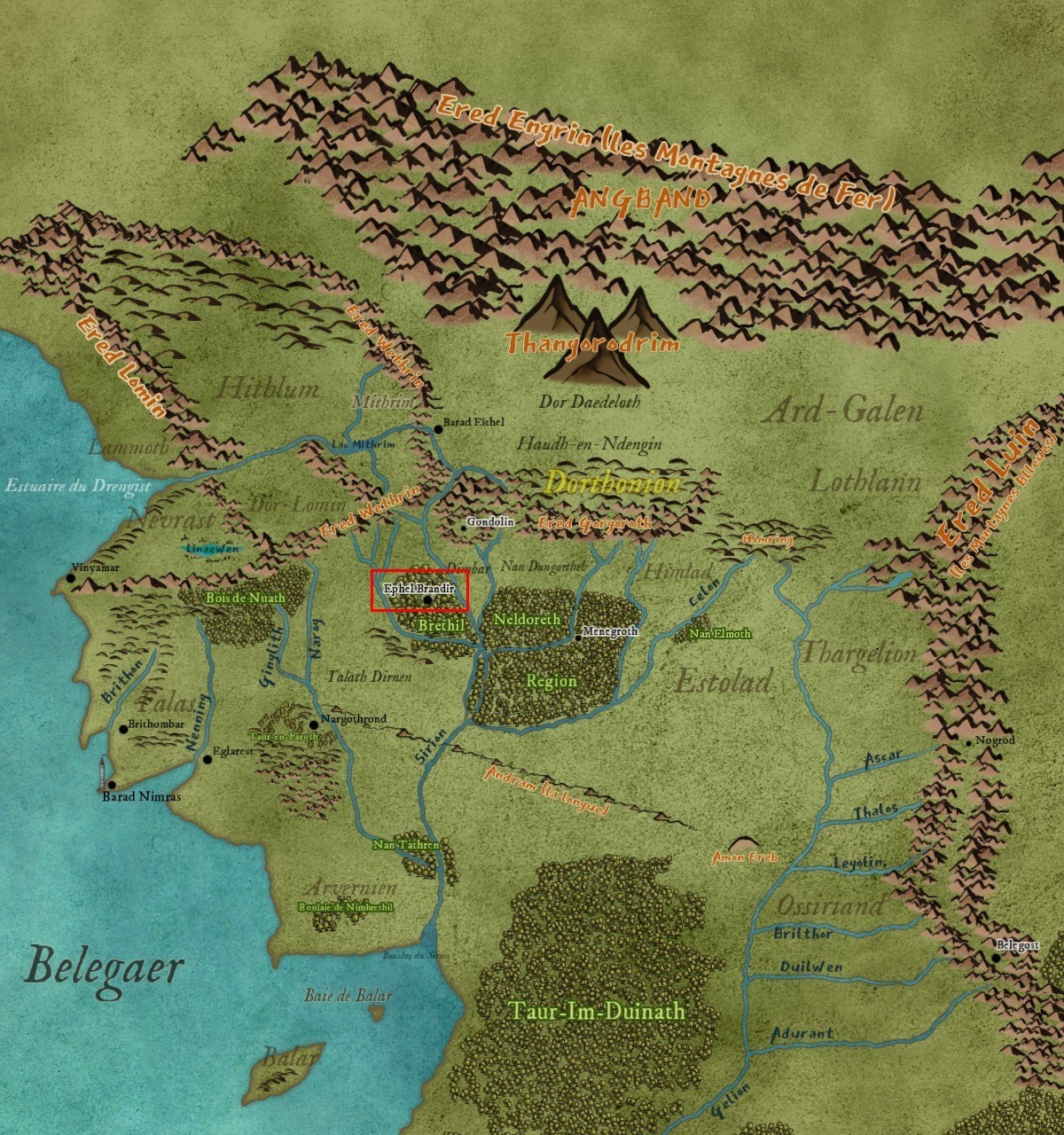Habitations mises à l’abri derrière une palissade sur une colline nommée Amon Obel, dans la forêt de Brethil.