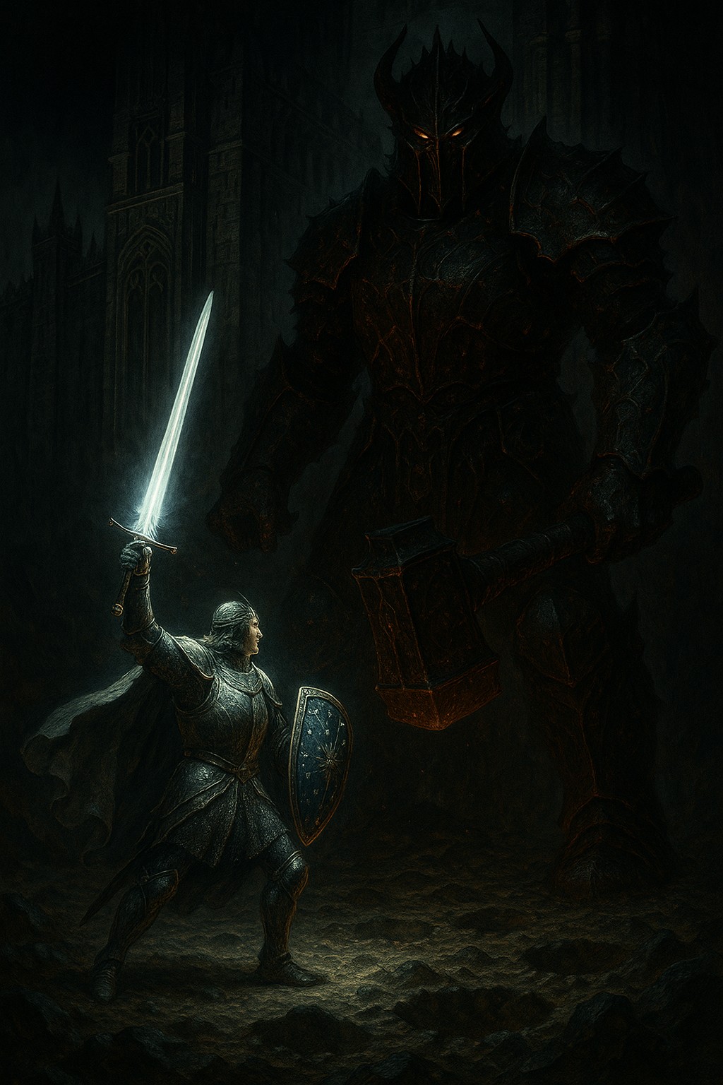 Année 456 (Premier Age) 9). Fingolfin apprend la défaite des fils de Finarfin et de Fëanor. Furieux et déterminé, il traverse, sur son cheval Rochallor, Dor-nu-Fauglith et se présente devant les portes d'Angband. Il frappe à la porte et appelle Morgoth avec son cor afin de le défier. Même si Morgoth est un puissant Vala il connait la peur. Mais il ne peut refuser le duel devant ses capitaines. Fingolfin est éclatant, il porte un haubert d'argent. Son écu azur est serti de cristaux. Il dresse son épée Ringil. Chaque fois que Morgoth abat son marteau Grond, Fingolfin l'évite. Fingolfin parvient à blesser Morgoth à sept reprises. Mais Fingolfin fatigue et Morgoth réussit à l'écraser avec son écu. A trois reprises Fingolfin parvient à se relever. Il trébuche dans un des trous formé par le marteau de Morgoth et il tombe à ses pieds. Morgoth l'écrase au niveau du cou. Fingolfin parvient à lui taillader le pied avec son épée avant de mourir. Aucun chant ne sera créé sur cet évènement si tragique mais l'histoire le raconte encore. Morgoth saisit le corps de Fingolfin et le brise. Thorondor surgi et s'empare du corps pour le déposer au sommet d'une montagne au nord de Gondolin. Turgon fait ériger un cairn à cet endroit. il est dit que plus aucun Orque n'osa se rendre à cet endroit jusqu'à la chute de Gondolin.