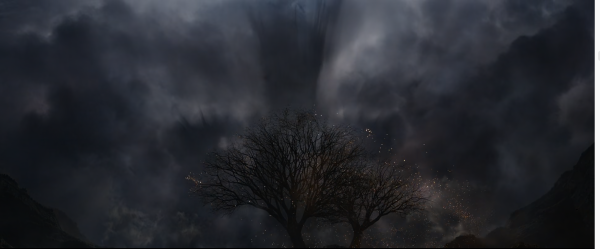 Symbolisme visuel : Une silhouette sombre, représentant Morgoth, est brièvement visible surplombant l'un des Arbres de Valinor, illustrant sa menace sur le monde.