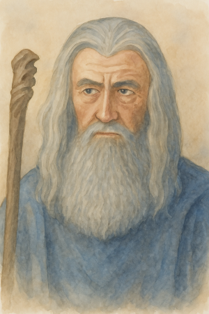 Gandalf et les Hobbits prennent la direction de la Comté. Ils s'arrêtent en chemin à Brie. Dans le texte Gandalf est décrit comme tel: